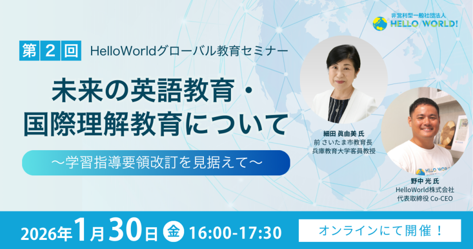 細田様より、最新の学習指導要領改定の議論を踏まえたお話をいただくとともに、HelloWorldの共同代表・野中より、現在HelloWorldが新たに開発を進めている「HelloWorld・グローバル教育カリキュラム(仮称)」の全体像・進捗状況などをお話しさせていただきます。